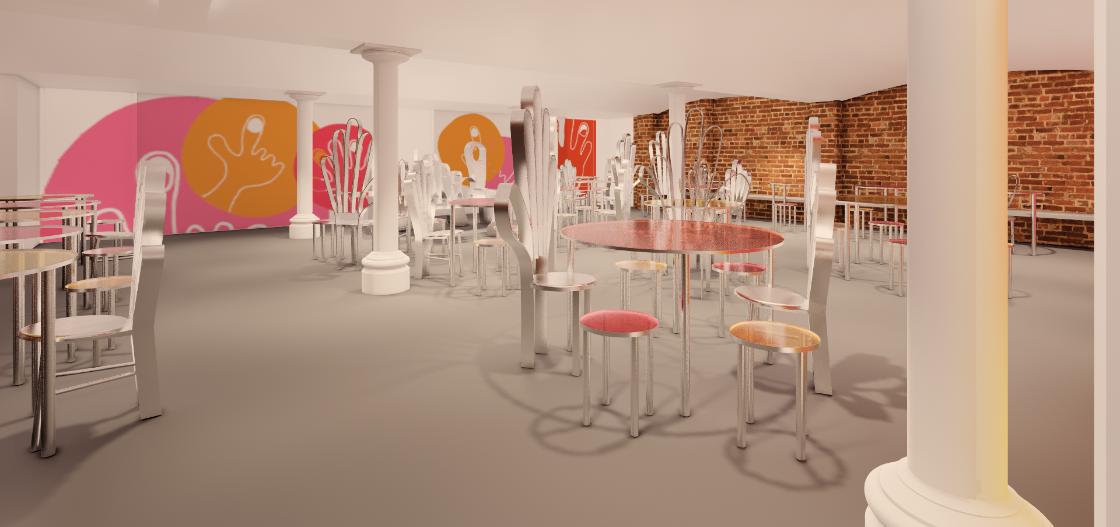 Your donation is helping to create an incredible new space, including an immersive café designed by acclaimed British artist Emma Hart. It’ll be a space to gather and feed your creativity, whilst you enjoy delicious food and drink. We wanted you to be the first to see our latest mock-ups for the space, featuring specially designed furniture and Hart’s custom mural.