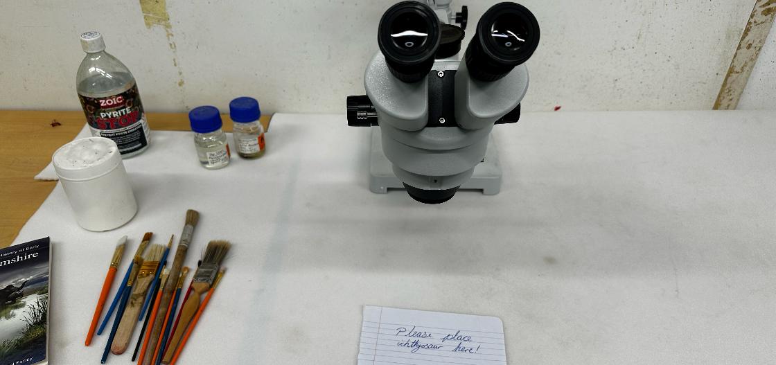 Our conservator, Tabatha along with a team of volunteers recently visited the fossil in MK Library to assess its current condition and to work out the best way to remove it from its mount. While we work on the risk assessments and gather all the tools we need to safely bring it to the Museum, Tabatha is making room for our friendly monster in her lab. The microscope is ready so that she can get up close and personal with the Ichthyosaur as soon as it arrives!