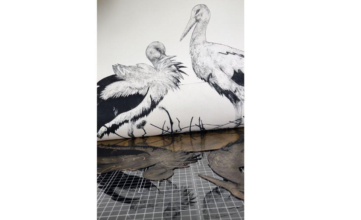 Marian Haf Works from her garden studio in her native corner of Ceredigion West Wales taking inspiration from her life in rural west Wales a fine art painting graduate and self-taught printmaker working predominantly with collagraph enjoying its accessibility and possibilities. Marian works by tearing and drawing into mountboard which is inked intaglio resulting in soft tonal depth punctuated by sharp lines and staccato dots. The pieces in the exhibition are a mix of mountboard collagraphs and tetra pack prints partly made in response to her group residency at Knepp Rewilding.
