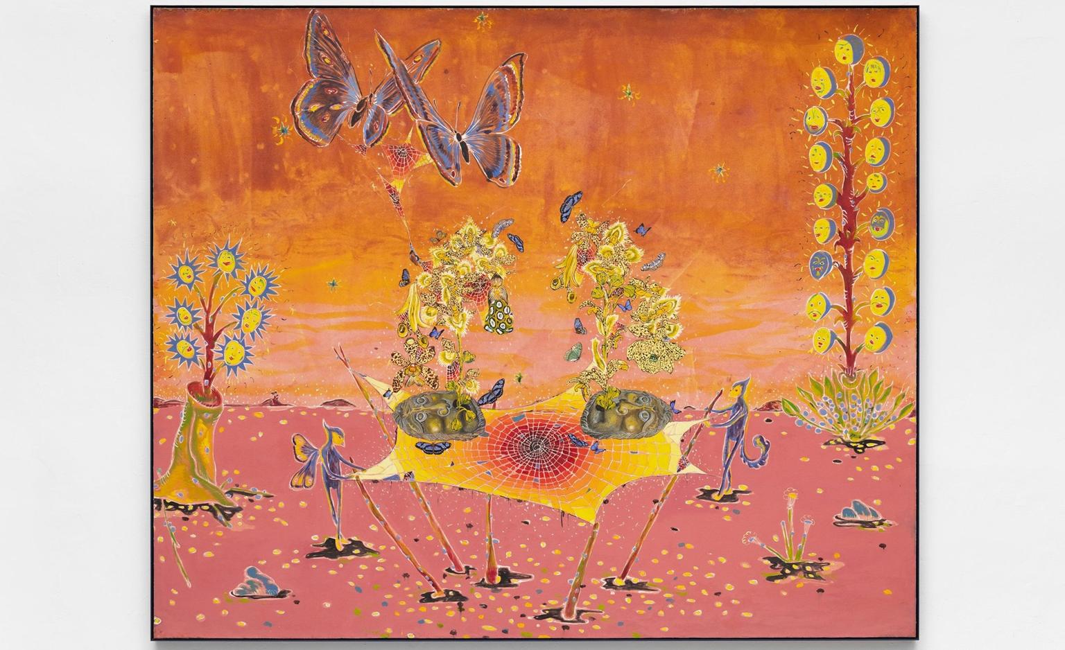 Brazilian artist Paulo Nimer Pjota presents new large‑scale paintings set within an immersive mural. Drawing on myth, folklore and pop culture, his work merges diverse references into imaginative, symbolic worlds filled with characters, creatures and cosmic motifs.