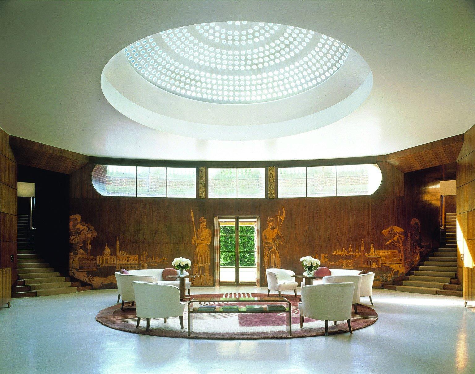 Marvel at Eltham Palace's glamorous Art Deco interiors that starkly contrast the ancient surroundings of the former medieval palace. The entrance hall is particularly striking, with a glazed dome that allows light to flood in, and walls lined with black bean veneer and decorated with marquetry, depicting Viking and Roman soldiers.