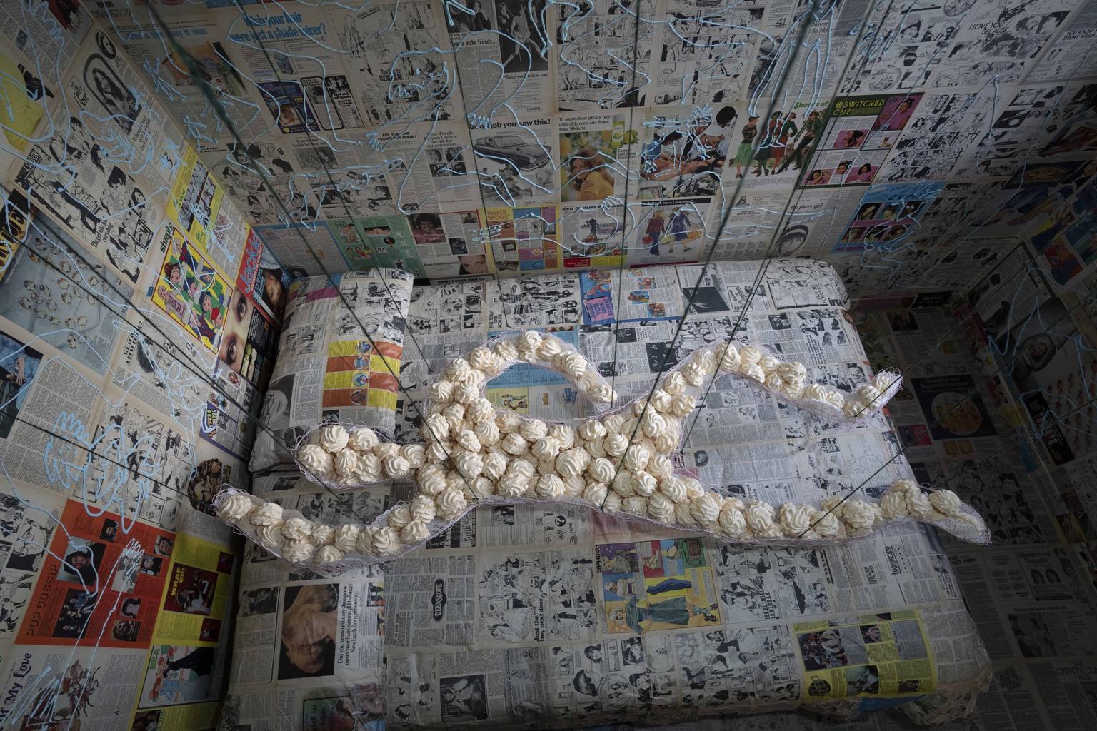 Bobby Baker was born in 1950 in Kent. Through darkly funny performances such as Drawing on a Mother’s Experience (1988) she has exposed undervalued aspects of women’s labour, and taboos surrounding both physical and mental ill health. Her icing-covered installation An Edible Family in a Mobile Home (1976) featured a cake family in the iced interior of a prefab and has been reconstructed for Tate Britain’s current exhibition ‘Women in Revolt! Art and Activism in the UK 1970-1990’.