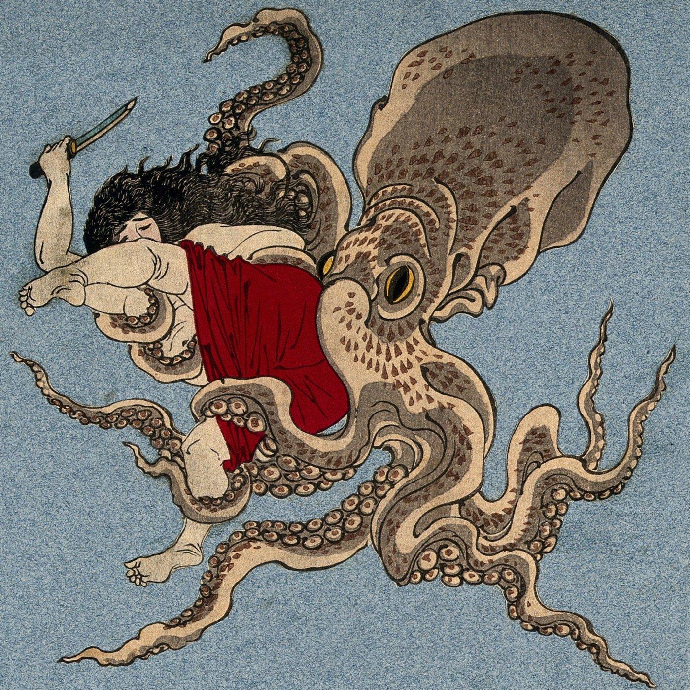 ‘These women have an important place in Japanese culture,’ Russell explains. ‘They are renowned for diving without breathing equipment and are admired for their courage and endurance.’ One of these remarkable divers is portrayed in Taiso Yoshitoshi’s dramatic woodcut A Woman Abalone Diver Wrestling with an Octopus (c1870). ‘Yoshitoshi was a popular printmaker – the last in a great line that included the celebrated Hokusai,’ says Russell. ‘Scenes of violent conflict were his speciality, and here he shows an ama battling a giant octopus.’
