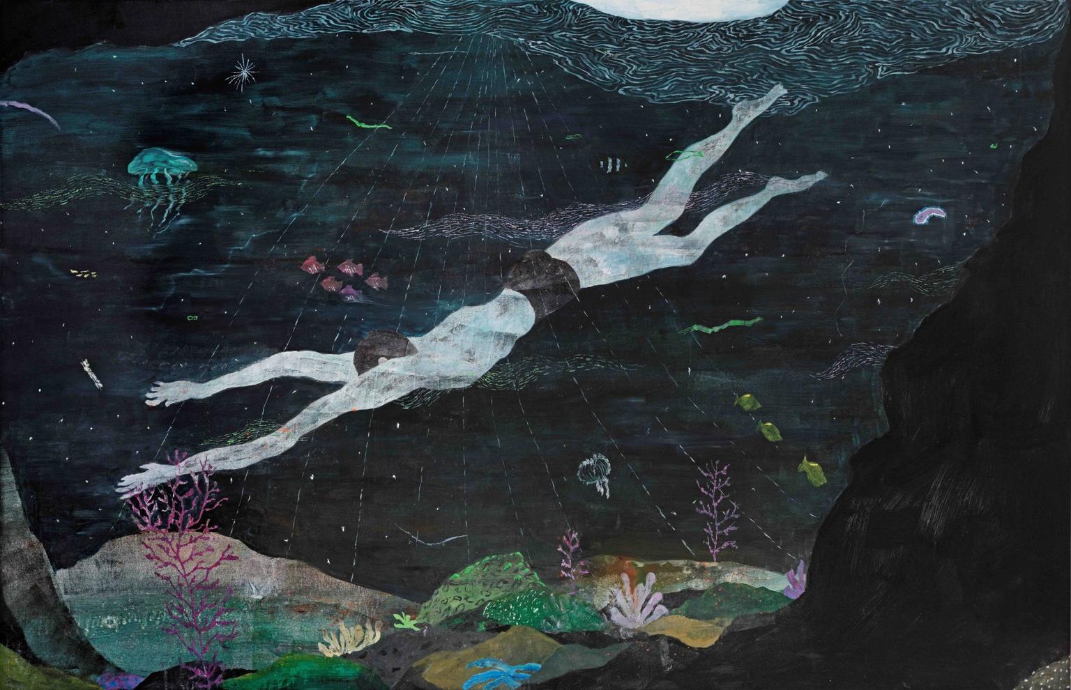 Whereas Erb relies on imagination, the Greek painter Yiannis Maniatakos (1935-2017) donned diving gear to paint his haunting views of the seabed directly from observation. Typically spending up to five hours per dive, he painted on waterproof canvases and weighted himself to the seafloor as he captured marinescapes around the Cycladic island of Tinos. Untitled (2000) shows a sandy seabed lit with sunbeams disappearing into a murky cloud of blue-black water. The scene is eerily devoid of life, unlike Tom Anholt’s painting Deep Dive (2022), in which a figure descends into the depths surrounded by different marine creatures.