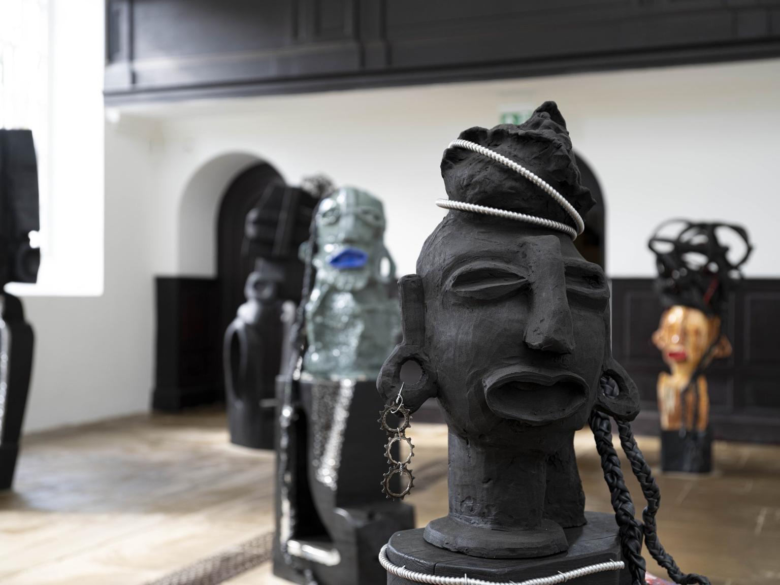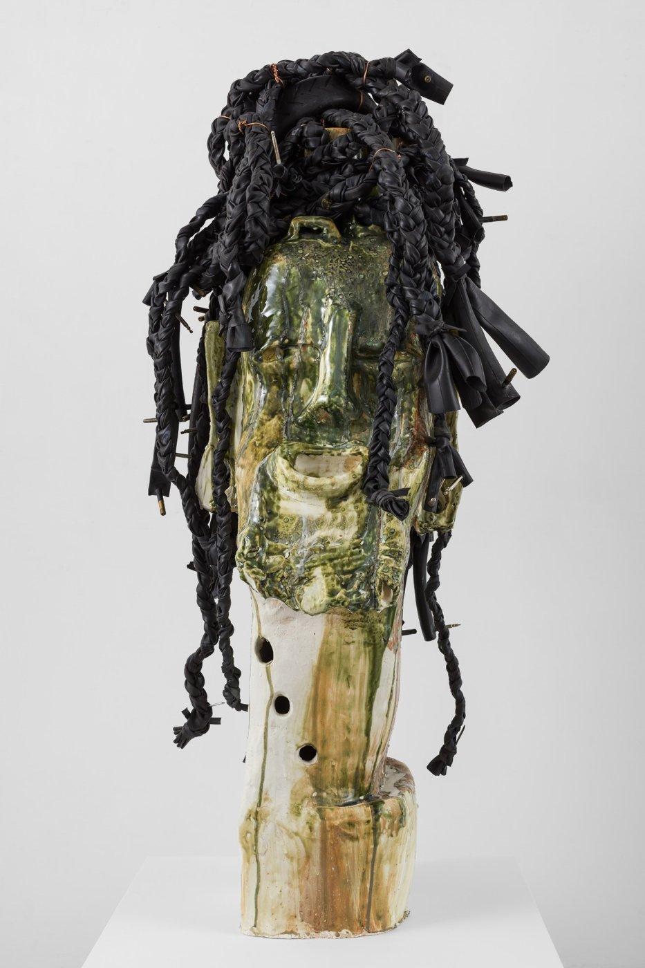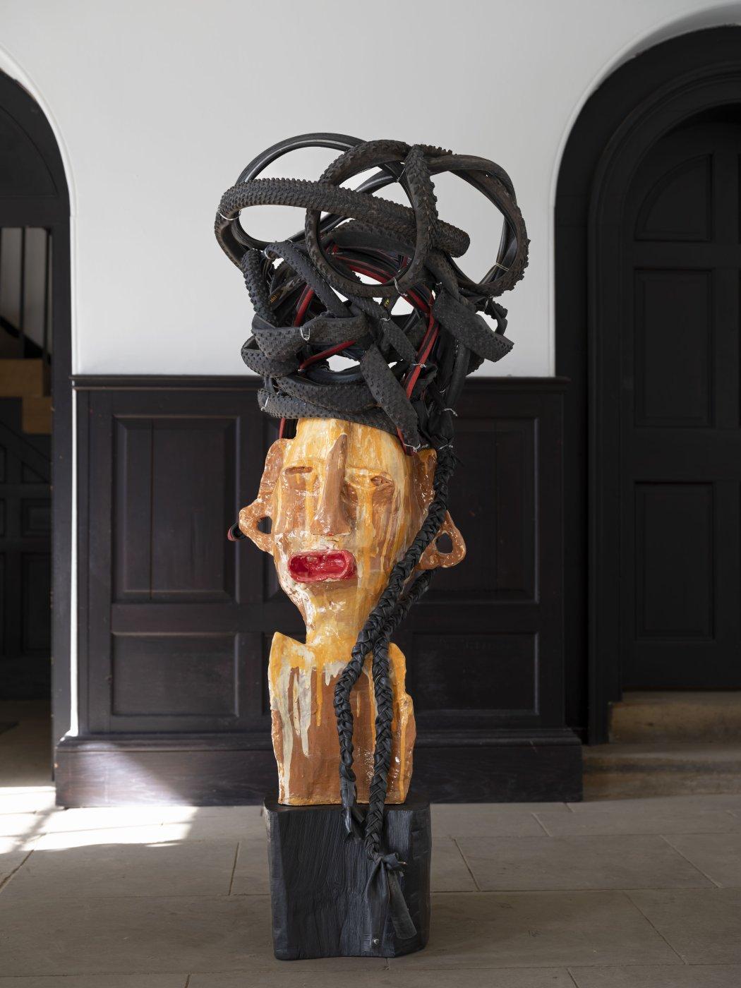 EMDW: You also work with ceramics, such as your work Nagirinya from the Kuchu Ngo (Leopard) Clan (2021), a portrait sculpture made from glazed ceramic with bicycle-tyre inner tubes and copper-wire clips, which has been acquired for the Herbert Art Gallery & Museum in Coventry with Art Fund support. How does working with ceramic differ from wood?