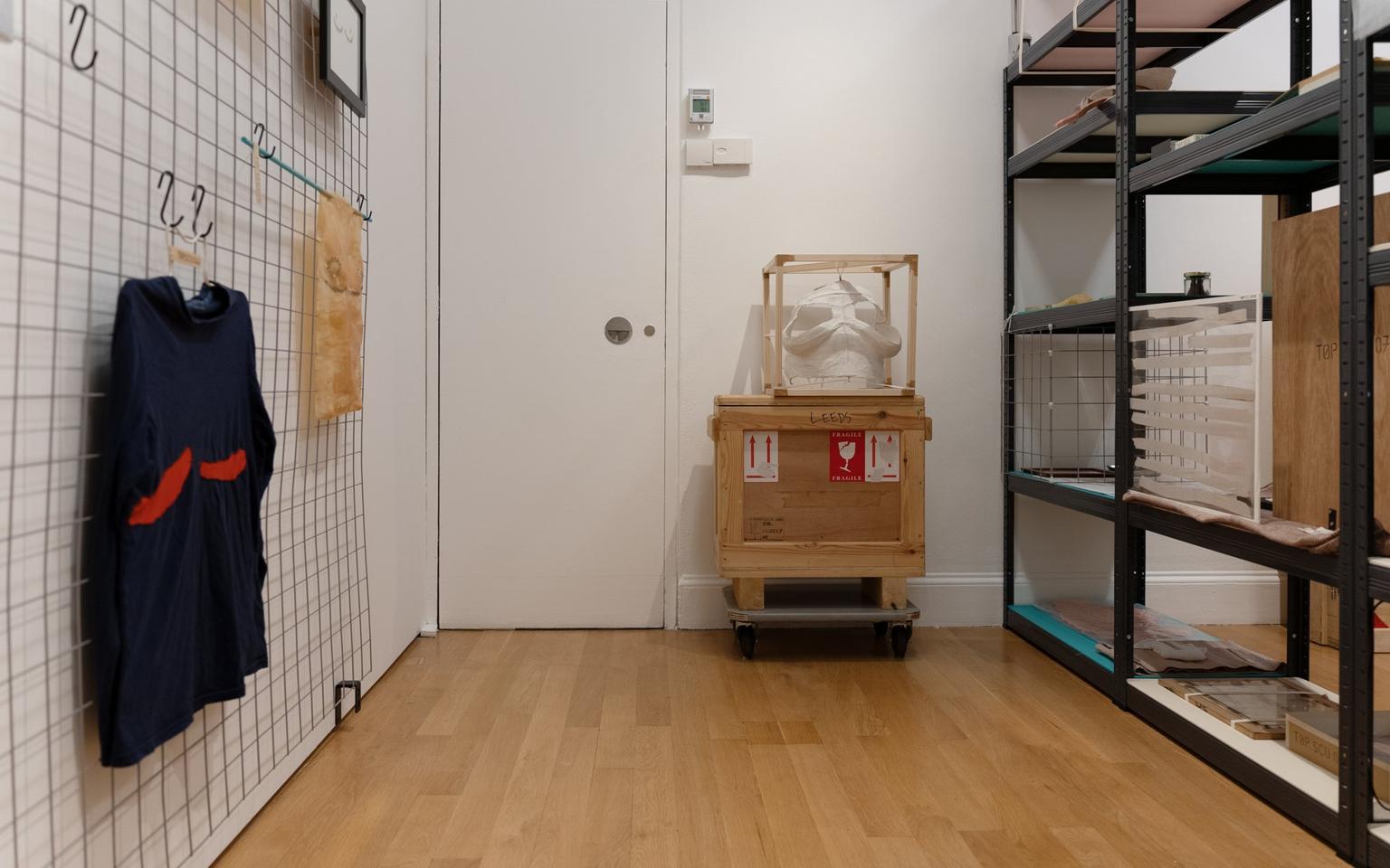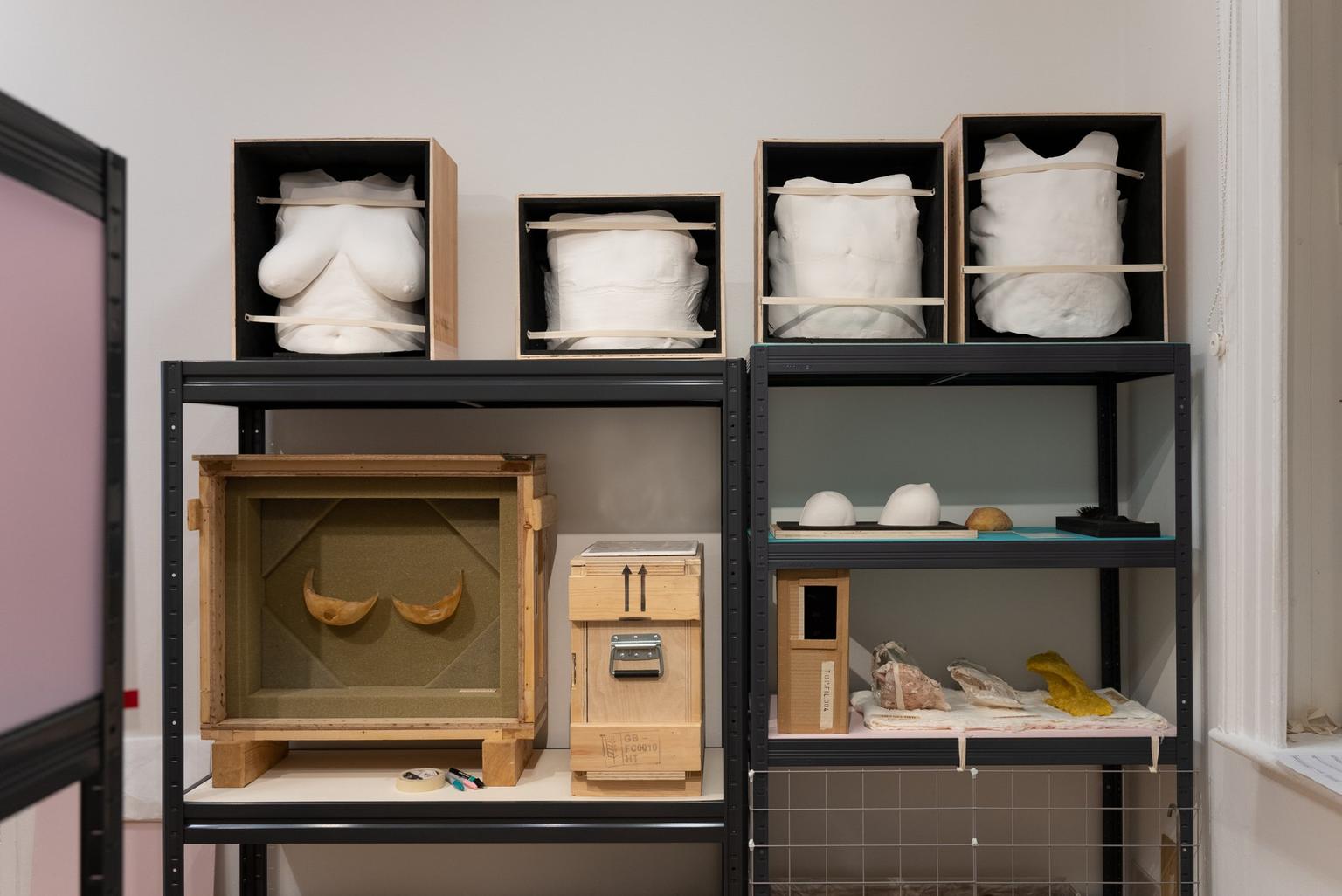 Bowler has described Top as a ‘celebration of being trans and overcoming struggle’. To document his experience, he has gathered together latex and plaster casts of his upper body before and during the process of top surgery (an operation to remove chest or breast tissue), together with photographs, videos, paintings, drawings and letters. The work is presented as if it were in a museum archive, with objects displayed in wooden storage crates and drawers on metal shelving racks.
