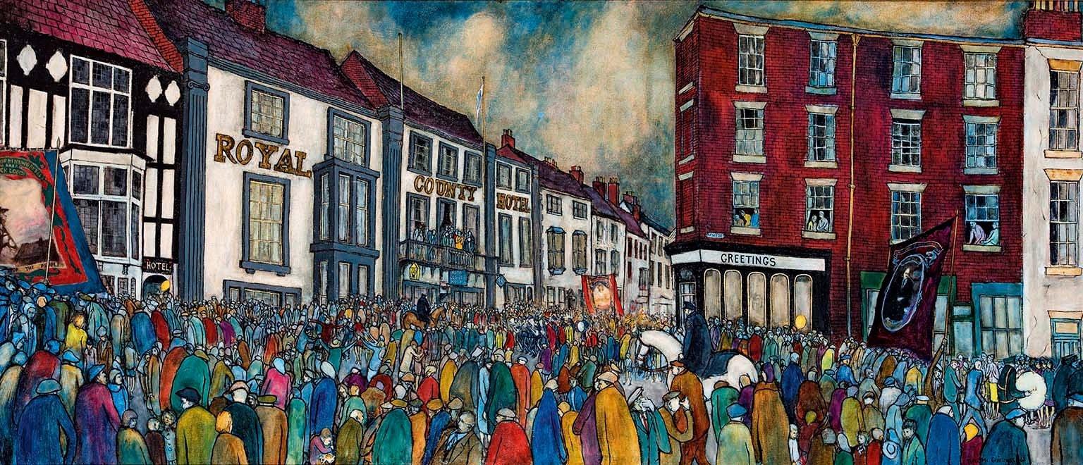Around the time the book on McGuinness was published, the artist’s 1968 painting Durham Big Meeting came up at auction, a richly detailed scene of the annual Durham Miners’ Gala hosted by the Durham Miners’ Association every July since 1871. Since the demise of the mining industry, the gala has continued as a wider celebration of community, solidarity and trade-union spirit.