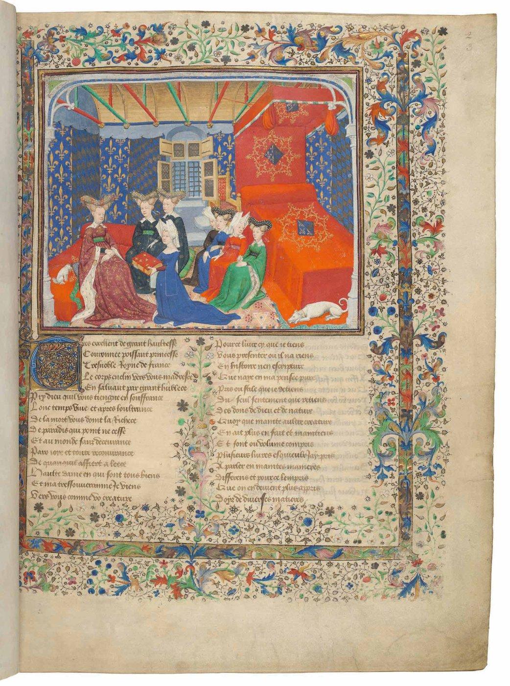 In City of Ladies de Pizan also praises a woman book illuminator named Anastasia, whose painted borders and backgrounds were unsurpassed throughout Paris. ‘I know this from experience,’ she added, ‘for she has executed several things for me which stand out among the ornamental borders of great masters’ (from translation as earlier). Although Anastasia’s work remains unidentified, it is quite possible that she worked on The Book of the Queen. If so, then this most gorgeous of manuscripts would exemplify women’s cultural activity at the level of author, patron and craftswoman.