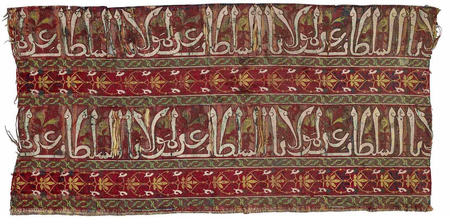 In al-Andalus (Islamic Iberia), a thriving silk industry created luxury textiles that were highly sought after throughout Europe. One beautiful example, which is on loan for the exhibition from the Whitworth in Manchester, features a classic design favoured in the 14th and 15th centuries, with stripes bearing the calligraphic Arabic inscription ‘Glory to our Lord the Sultan’, alternating with floral and interlace knot-work designs. Although the specific craftspeople who made this beautiful textile are unknown, recent research has indicated that the skilled work of cultivating, processing and spinning silk in al-Andalus was carried out largely by women.