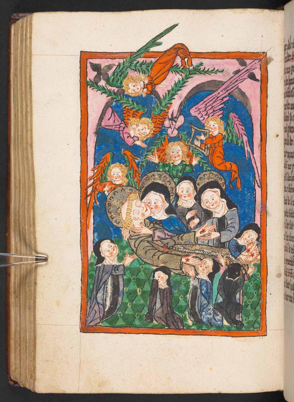 In its style, subjects and expressive qualities, Von Bondorf’s artwork is typical of a movement of women’s book production in German-speaking lands known as Nonnenarbeit (nuns’ work). Nuns’ creations were unconventional because they often had limited access to artistic training and little contact with the world outside the cloisters. Their works have often been dismissed as naïve, crude and inferior. Yet their idiosyncratic features can be regarded as intentional, designed to articulate the nuns’ distinctive ideals and spirituality. As Von Bondorf’s illuminations demonstrate, Nonnenarbeit is often startling in its exuberance, beauty and sincerity of feeling.
