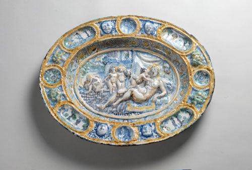 This oval dish moulded in relief has a central subject depicting fecundity, a reclining female nude with five gambolling putti, and the border has decorative ovals containing landscapes and circles containing waist length figures and stylised flowers. This is one of the rare group of recorded English maiolica 'Fecondite' dishes modelled after a supposed original by the French potter, Bernard Palissy. This particular dish is unusual in that the circular compartments in the border contain heads instead of the usual armorial motifs or initials. It has been suggested that these may portray monarchs (Charles II and James II). Another curious feature is the roughly-drawn head in the foliate rim, apparently in puritan costume, which again may represent Cromwell.