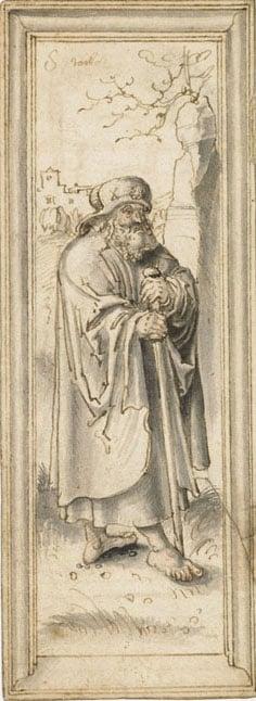 St. James wearing a pilgrim's hat and standing in a landscape. This is one of 111 drawings bequeathed to the British Museum by Rosi Schilling in 1997. The majority of this collection of drawings formed by Dr Edmund Schilling was bequeathed to the British Museum through the Art Fund by his widow, Mrs Rosi Schilling, in 1993. Schilling was a former curator of the Stadelsches Kunstinstitut in Frankfurt, who emigrated to England in 1937. He was one of the few acknowledged specialists in this country on German graphic art, and built up his collection during the 1940s and 1950s in London when, Northern drawings were unfashionable and could be bought relatively inexpensively. His collection included drawings by major artists such as Hans Baldung and Lucas Cranach.