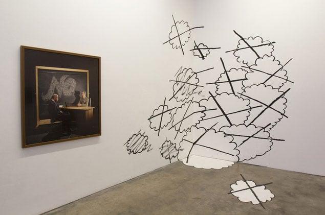 Sutcliffe is best known for his ‘video collages’, manipulating broadcast material to create visual social commentaries. Also included are No, a photograph inspired by cartoonist Saul Stenberg, and a wall drawing of crossed-out thought bubbles.