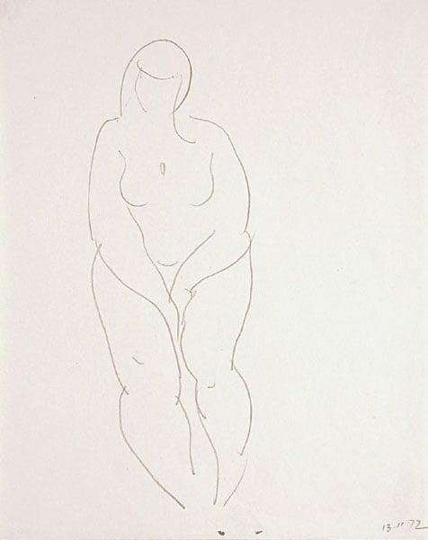 Five pencil drawings on paper: 1) 'Coy Nude' by Ivon Hitchens (illustrated), 2) 'Biddy Lamb' by Lynton Lamb, pencil on paper; 3) 'Four Stone Studies' by Brenda Chamberlain; 4) 'Asleep' by Ian Pollock; 5) 'Two Poor Russians, Yaroslavl' by Gennady Antonov. Three watercolours: 6) 'Sea sickness - study from Scarp' by Norman Adams; 7) 'Miss Nangle sewing in the Woodshed' by Thomas Hennell; 8) 'Towers of monastic buildings, evening' by Alexei Yegorov. 9) 'The Creature from Another Island' by Brenda Chamberlain, ink on card; 10) 'A Great Feast... The Halt, The Maimed and the Blind' by Ian Pollock, mixed media and collage; 11) 'The Fennel Root' by Sir Cedric Morris, silverpoint on card; 12) 'A Bonfire of Twigs' by Angus Beaton, gouache and collaged strips. Presented in memory of the donor's parents Arthur Clement and Elsie May Freer.