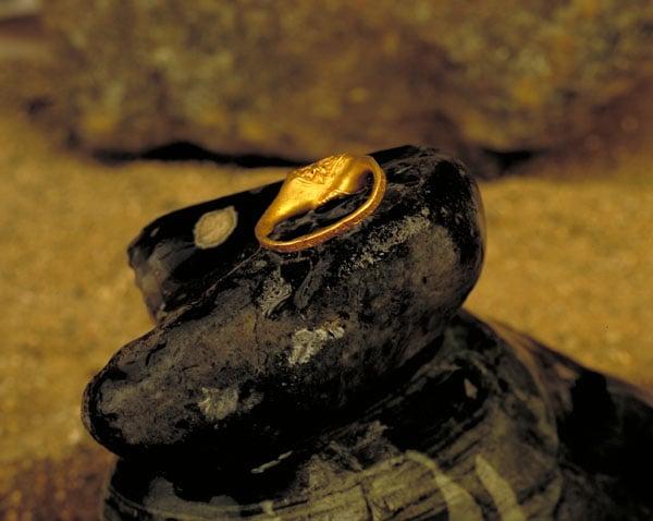 Gold ring with a rectangular bezel and setting for a gem, which is no longer present. Part of the finds from the Girona wreck. Purchased after a public appeal by the museum.