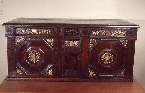 Two octagonal panels in front; centres and corners inlaid with decorated ivory surrounded with mother of pearl. Two oblong panels above similarly decorated and bearing the initials S.E. and dated 1672. Back and ends of the chest are panelled.