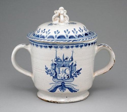 2-handled posset bowl. Lambeth delft ware. Painted in blue; ornamental shield, initials I.C. and date, 3 fleur de lys.