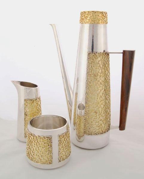 The service comprises of 1) coffee pot, 2) cream jug and 3) sugar bowl. The tall elegant coffee pot has an elongated spout and fused textures with gilded surface decoration on the upper half and lid. It has a teak wooden handle. The cream jug and sugar bowl have a matching decoration which is typical of 1970s style. Purchased by the Art Fund with the assistance of the Esmée Fairbairn Foundation.