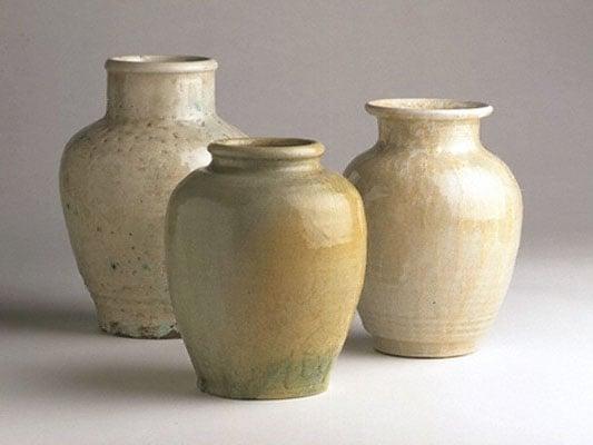 1) Bowl of mottled and red lacquer with silver lining, 16th century. 2) Oblong box of painted lacquer, 1600, signed Chin Kao-Shan. 3) Large box of carved red lacquer, 18th century. 4-5) Glazed earthenware vases, by Reginald F.Wells. One of twenty seven gifts to seven museums by A E Anderson through the Art Fund between 1922 and 1938.