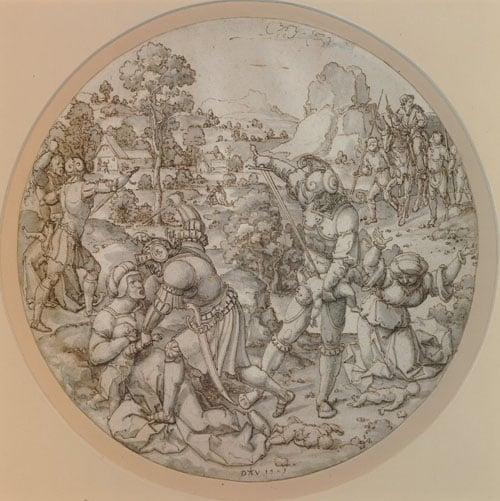 Four designs for glass roundels from a series representing Old and New Testament subjects: Naaman bathing in the Jordan, the Massacre of the Innocents (illustrated), The Flight into Egypt and the Marriage Feast of Cana. Part of a group of drawings selected from the collection of the late Francis William Smith.