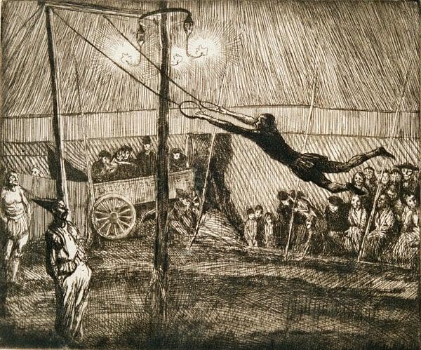 4 etchings: 1) Auxerre, 1913; 2) Gerona, Jan. 1914; 3) A Terrace, 1911; 4) Travelling Circus, 1914 (illustrated); plus a lithograph 5) Portrait of a Chef, 1911-14; and a drawing 6) Cathedral Facade. Part of three bequests to four museums by Osbert H Bernard through the Art Fund between 1922 and 1988.