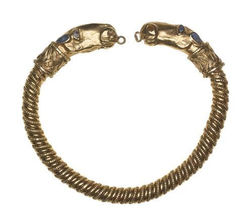 The bracelet is of twisted gold wire ending in ponies' heads of repousse gold, encrusted with coloured glass. It was found in South Russia and is a fine example of Graeco-Scythian gold-work, an important class of jewellery.