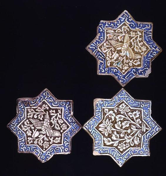 5 lustred tiles: 4 star-shaped, inscribed border, foliated ornament. Golden-brown lustre, touches of pale blue. 1 square, Neshky inscription, lustred scrolls,