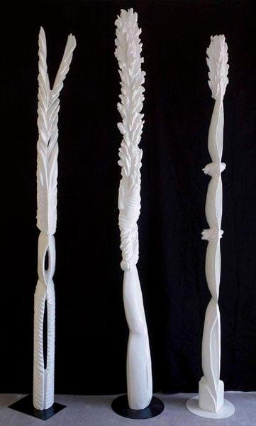 The work consists of three totem poles covered in epoxy resin including the Tangaroa mask, a recurring motif in Ioane's work. Tangaroa is the god of the sea and the ocean is an important aspect of Pacific culture. They address the concept of guardianship and also the changing context for Polynesian in Western society - literally whited out. Born in New Zealand of Samoan descent, John Ioane has developed an interplay in his work between the spirit of traditional Samoa and the culture of contemporary New Zealand.