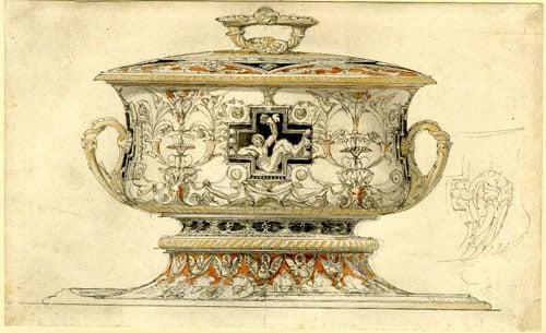 6 drawings: 4 water-coloured designs for pottery covered dishes; 1 pencil design for a silver cup; 1 pencil design for an architectural facade with sgraffito work.