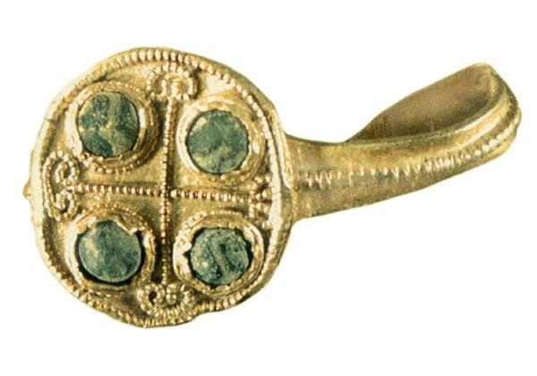 A ring with a circular bezel divided into four with a fine beaded wire framing four collared settings of glass beads. The hoop is partly flattened and distorted. It shows rare evidence of a personal belonging from the middle stratum of society below the aristocracy but above the peasant or similar craftsman level.