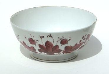 6 pieces made at the Gardner factory, Velbilki, Moscow, Russia, 1-2) Bowl and stand with blue line borders, with an inscription in arabic; 3) bowl in sepia-pink with enamelled stylised leaf and flower forms; 4-5) bowl and stand with Chinese style decoration of enamelled peonies; 6) saucer dish with broad red border. Two pieces from unknown Russian factories 7) plant pot with fluted shape and 8) dish with green and yellow floral decoration. Many made for export to Persia where they were acquired by the donor.