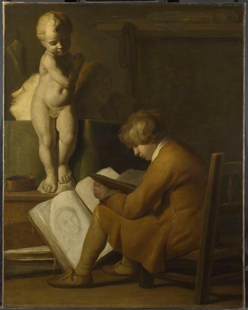 The boy is reading, there is a book at his feet in which he was drawing a cast of the Christ Child from Michelangelo's statue of the Virgin and Child, known as 'The Bruges Madonna'. One of thirteen gifts to five museums by J G Lousada through the Art Fund between 1921 and 1939.