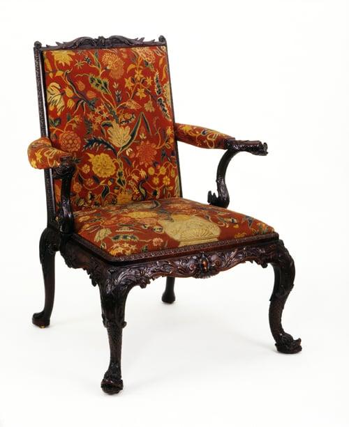 1. Early 18thC cabinet, of walnut with cross-banding; inside 16 drawers of various sizes, probably intended to house curios 2. Mid 18thC armchair; frame is mahogany carved with foliate scrolls, while ends of arms and legs are carved with dolphins. Part of a donation of 16 gifts and 1 bequest to five museums by the Brigadier Clark Fund through the Art Fund between 1936 and 1992.