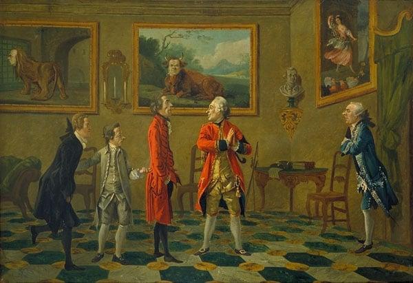A caricature group in Florence, with the figures of Sir Horace Mann, David Garrick and two young men with their tutor. Caricature paintings on the walls.