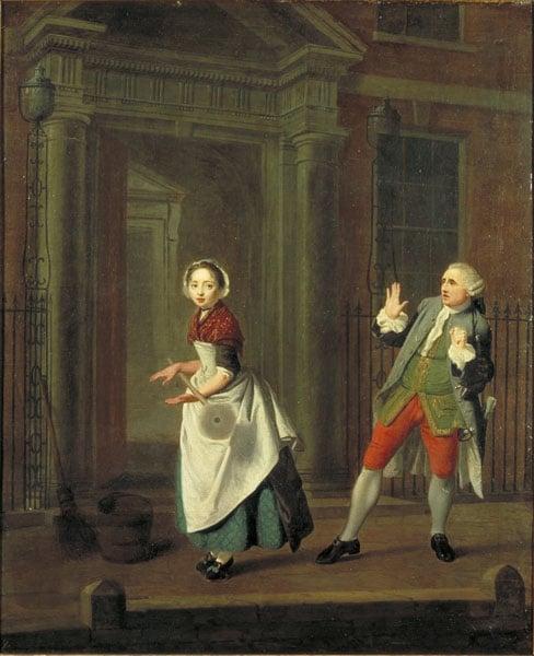 A scene from Jonathan Swift's 'Description of a City Shower'. A maid trundles a mop on the pavement and wets a gentleman passing by.