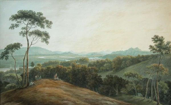 This view looks towards Stirling Castle rock from the south, depicting the windings of the River Forth with sailing boats. The town of Alloa can be seen centre right with the Ochil Hills and the wilds of the Trossachs in the distance. The landscape is heavily wooded and shown in summer with delicately painted trees in full leaf.