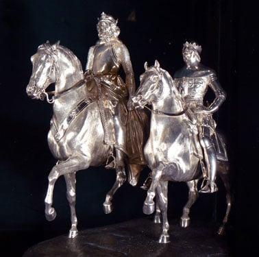 Cup in the form of a centrepiece showing the captive King John of France entering London on May 1357, escorted by the Black Prince to whom he had fallen captive at the Battle of Poitiers. It was won by Lord Rothschild's horse Hungerford. Designed by Marochetti, made by Hancock.
