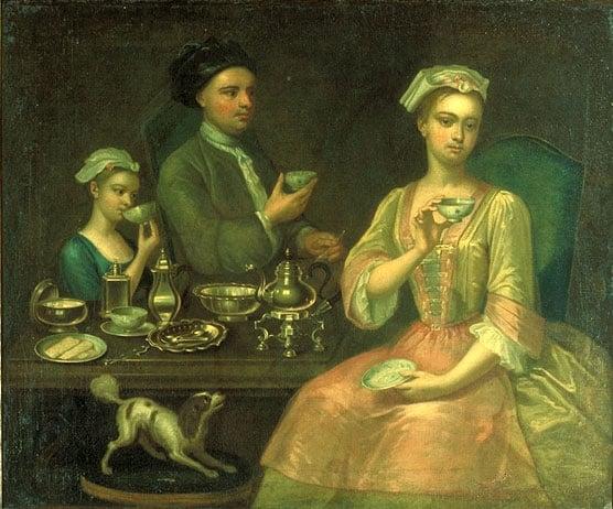 A tea party - a young couple and a girl drink tea beside a table showing contemporary silver in detail.