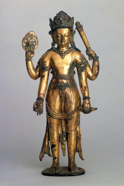 The statue is made of bronze with incised decoration, gilt and set with gemstones. The god is shown with four arms, holding the wheel of life and death,etc. The bronze is heavily patinated, showing mineralisation to malachite in places.