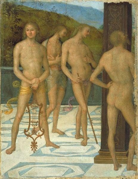 Four nude male figures in contrasting poses, curving or angular. Previously catalogued as The Court of Apollo.