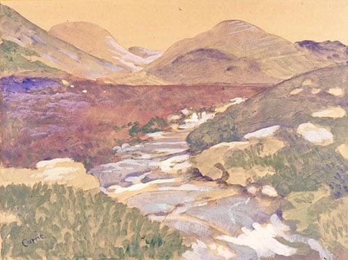 A Highland scene. From the distant blue mountains a rapid stream runs through moorland heather to a green foreground. One of thirteen gifts to five museums by J G Lousada through the Art Fund between 1921 and 1939.