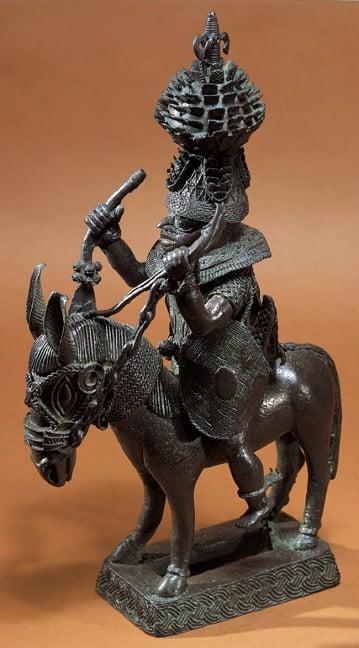One of the few Benin bronzes to leave the country before 1897, when the rule of Obas came to a sudden end. The bronze was given as a gift to Swainson, an agent for James Pinnock, a Liverpool merchant in Benin in 1892, for the successful signing of a treaty. Probably represents a visitor to Benin territory, perhaps an emissary, or a member of an emissary's bodyguard, from the Moslem Emirates in the north and was possibly made to stand on the ancestral altars of one or more ruling Obas of the Middle Period (1525-1575). Three groups of horsemen totalling around a dozen pieces are known in Benin art; this sculpture belongs to the earliest which are the smallest and finest of all such works to survive.