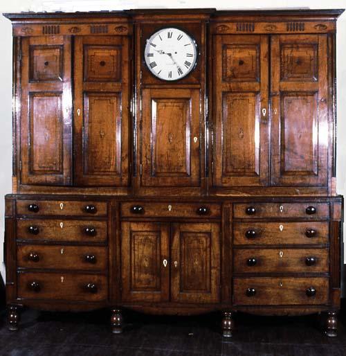 Oak with deal backing, decorated with marquetry inlay. Signed and dated 'Jos Butler, 1814' in marquetry on a secret door inside the left-hand cupboard. The centre panel inset with an eight-day movement clock by Thomas Joyce (1793-1861) of Whitchurch.
