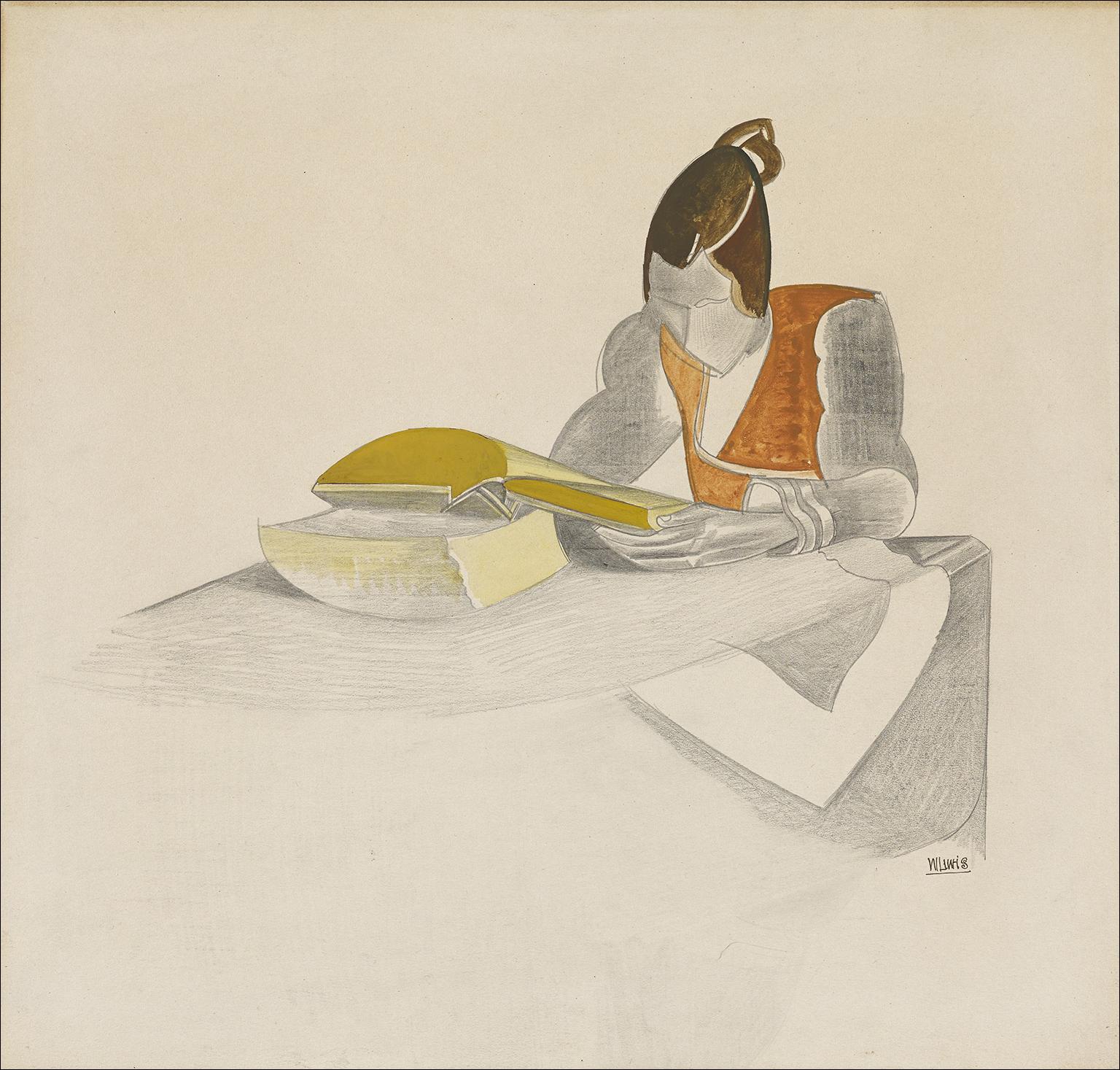 Percy Wyndham Lewis trained at the Slade School of Art in London and is celebrated today for his development of the geometric abstract style of painting, which Ezra Pound named Vorticism. After the Vorticist group broke up in 1915 Lewis fought on the Western Front and became an official war artist. Following the war he began to experiment with the more naturalist Modernism represented by A Lady Reading. The drawing was shown at Lewis’s 1921 exhibition ‘Tyros and Portraits’ at the Leicester Galleries in London. The subject is Iris Barry, Lewis’s lover, who is shown with her hair in a bun and wearing an avant-garde wrapover waistcoat. The drawing has most recently been in the collection of Valerie Eliot, widow of the poet TS Eliot. Iris Barry featured in several other works in the 1921 show, including Praxitella, a pivotal portrait by Lewis that is now joined by A Lady Reading in the Leeds Art Gallery collection.