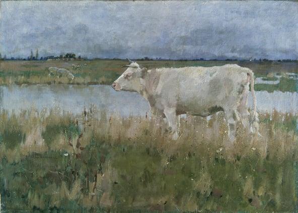 Painted whilst working with James Guthrie - both employing vigorous handling characteristic of the Dutch Impressionists whose work was popular in Glasgow at that time. There is also a Whistlerian emphasis on tonal qualities and flat design. Inscribed bottom left; 'To my Father, J.Crawhall Jnr'.