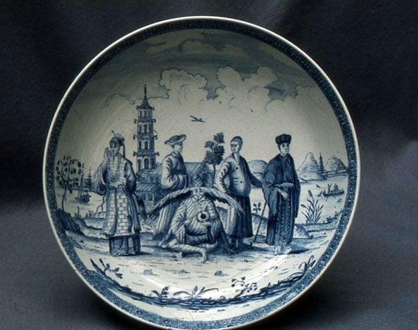 This is a well-known piece of Lowestoft porcelain and one of exceptional interest. The number '5' on the base is traditionally associated with Robert Allen one of the most prolific and accomplished of the factory's painters. The bowl is interesting in being securely documented and unique in design, based on an engraving by Hollar, entitled 'Chinese Priests and Monks'. Many Lowestoft pieces have chinoiserie decoration, but the choice of subject and detailed treatment here are without parallel.