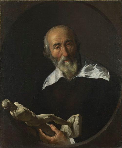 A long bust in a painted oval, turned quarter right, looking at the spectator. The left hand is visible, holding a small, armless statue resembling in attitude the Borghese 'Gladiator'. Originally attributed to Bernardo Strozzi when acquired.