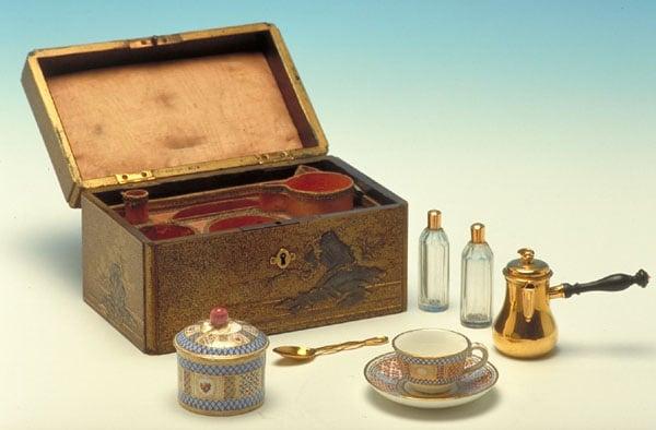 A necessaire de Voyage, a travelling Turkish coffee set for one person, consisting of a cup, saucer and sugar-bowl with lid, all in Sevres porcelain painted by Thevent pere, date marked 1776 and 1777; a small gold coffee pot, a gold spoon, and two glass water phials with gold tops, all with the hallmark of Ambroise Cousinet, Paris 1775. All fitted in a Japanese lacquer box. The whole set contained in a fitted Japanese lacquer box. The sucrier carries the Sevres paper sale label.