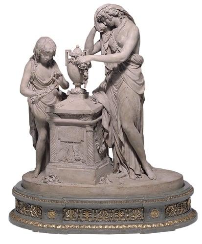 Sculpture of two female figures mourning by a poet's monument. This work was acquired with assistance from the Wolfson Foundation.