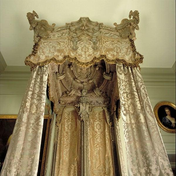 Tester with waved moulded cornice and deep fringed pelmet with canopied angles, the interior with lobed domed centre and moulded pilasters the the double scrolled headboard. This bed is an exact pair to one already at Beningbrough. The modern damask hangings are copies of the original. Displayed in the Blue Bedroom at Beningbrough Hall.
